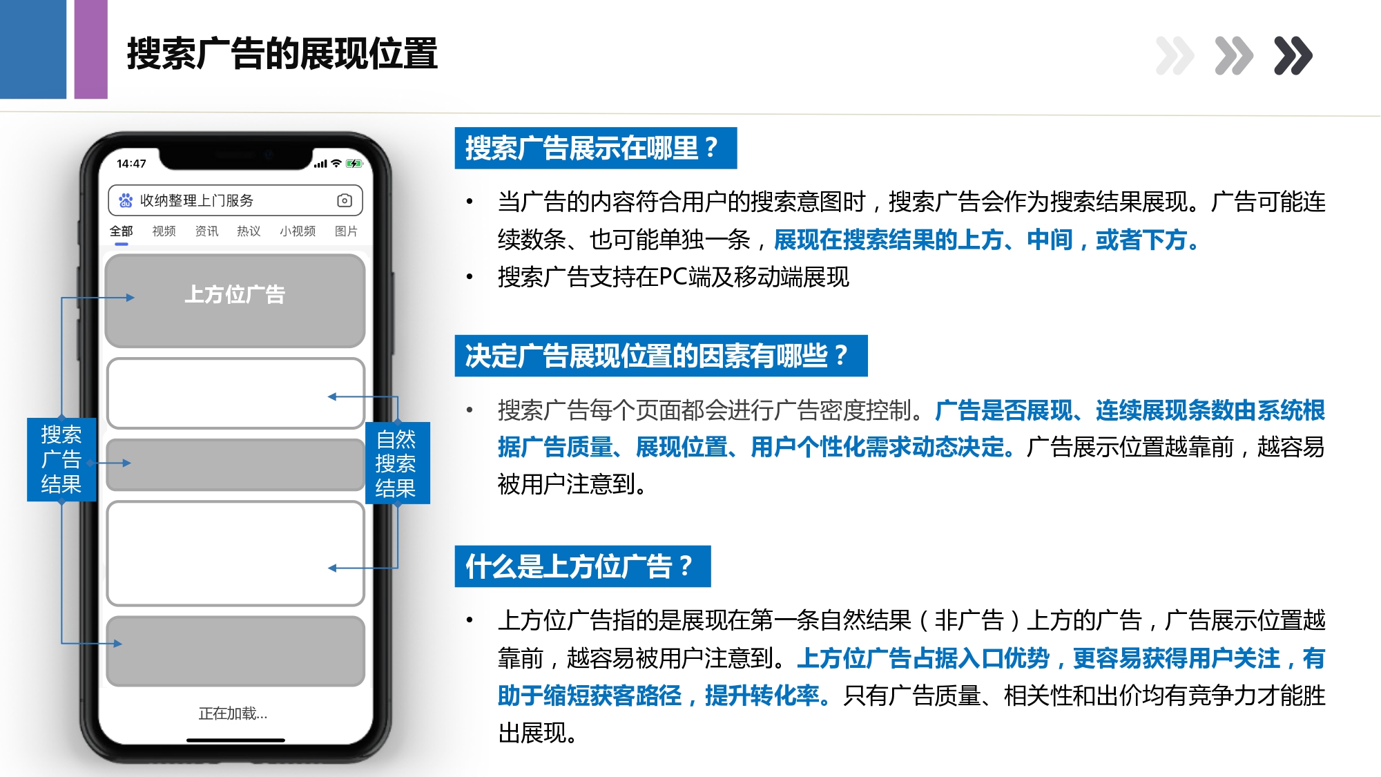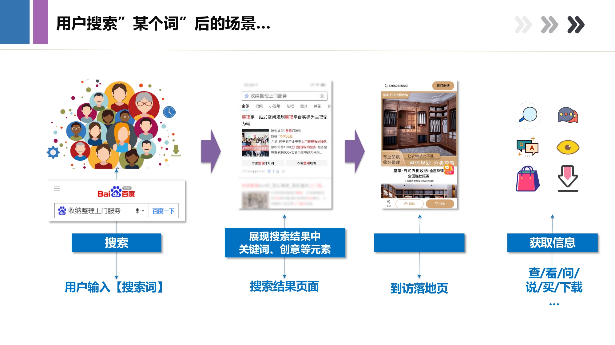 搜索推廣基于百度搜索引擎,用戶搜索關(guān)鍵詞,在百度搜索結(jié)果的顯著位置展示企業(yè)廣告信息,并幫助企業(yè)把用戶有效轉(zhuǎn)化為客戶的一種營銷方式。
